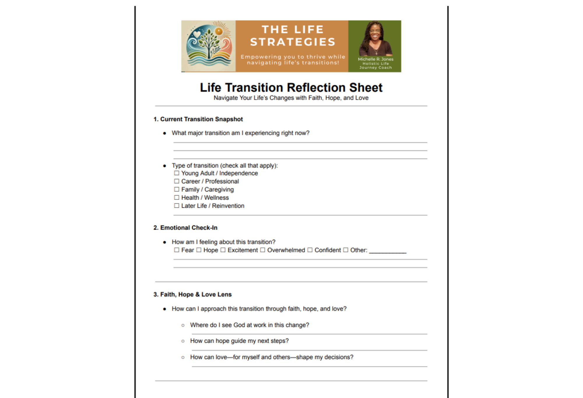Navigate life’s changes with faith, hope, and love! The Life Transition Reflection Sheet helps you reflect on current transitions, set actionable goals, and build resilience. Perfect for young adults, caregivers, or anyone facing change. Download instantly as a birthday bonus or life-planning tool. #LifeTransitions #FaithHopeLove #Reflection